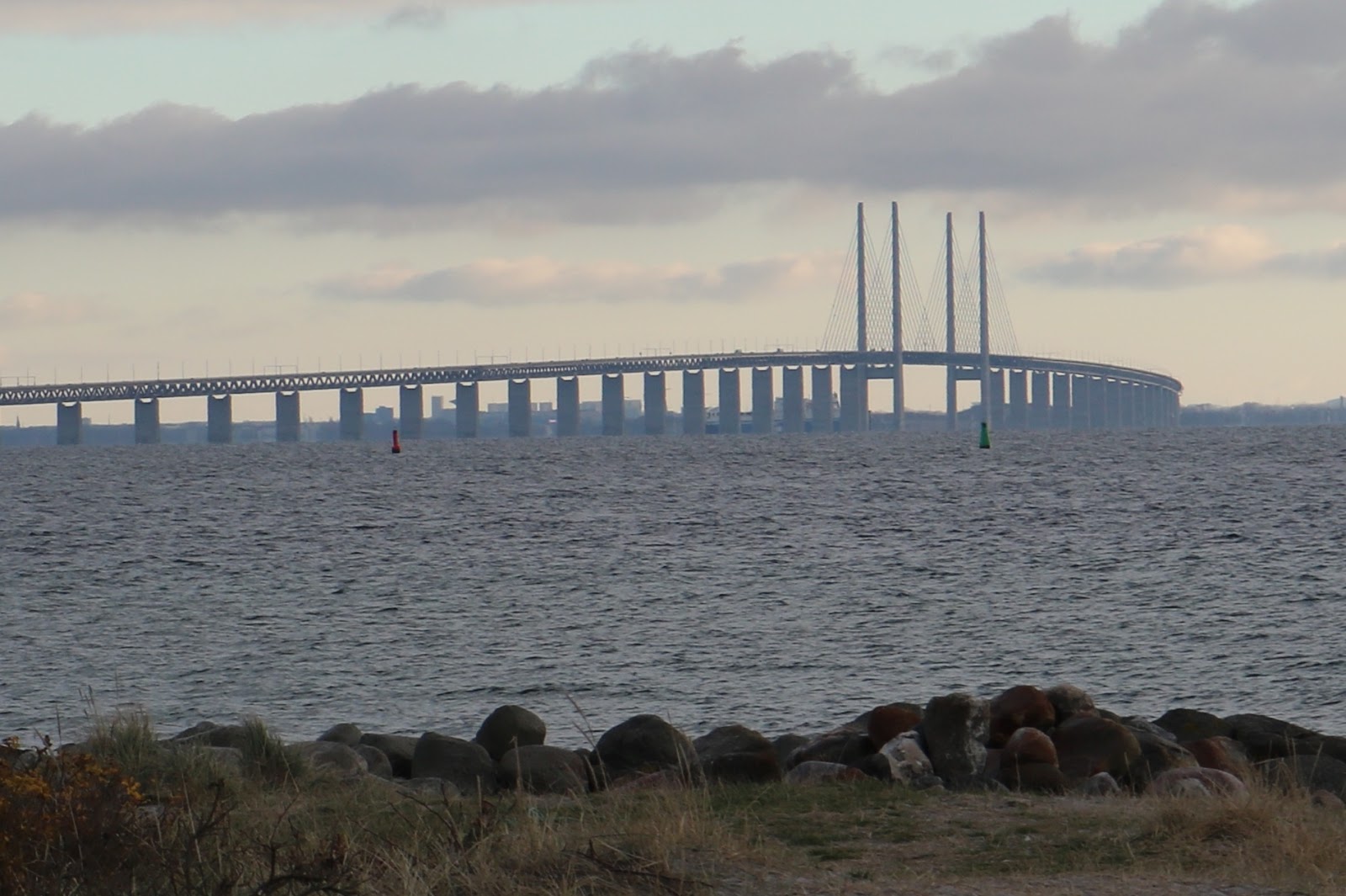 The Øresund Bridge is a combined railway and highway across the Øresund strait between Denmark and Sweden. From the Denmark side, we boarded the train at the airport station. The train first goes through a 2 1/2 mile section of tunnel under the strait to emerge above ground and connect to the 5 mile bridge. It is the longest combination road and railway bridge in Europe.